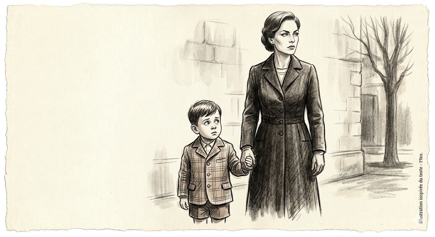 La voix sèche. Le regard qui l’écrase , qui le tient à distance , si bien qu’il se sent encore plus petit pendu au bout de son bras et sa main ,petite , tremble dans la sienne sans qu’il puisse la contrôler. Juste un petit frémissement. Peut-être elle n’a rien senti. Si sûrement. Elle sent tout ,voit tout , entend tout , sait tout. Alors il se tient bien. Tout droit .Dans son manteau à carreaux , son pantalon tout neuf et ses chaussures vernies. Il se tient autant qu’il peut. C’est à dire qu’il s’efforce de se faire oublier. De n’être qu’un enfant tout beau et tout gentil. C’est comme si elle lui tendait une image de lui et qu’il doive coïncider. C’est un jeu qu’il s’est inventé. Il se voit. Parfait. Et il essaie de correspondre. C’est dur. Il y a toujours quelque chose qui ne va pas mais ça passe le temps. Toujours il se tient bien. Il se retient pour ne pas déborder cette image parfaite , comme quand il colorie un dessin et qu’il s’applique. Même son souffle. D’ailleurs ça lui fait une boule dans la gorge et une douleur dans le dos. Aussi la main qui devient un peu froide d’être suspendue comme ça en l’air.
